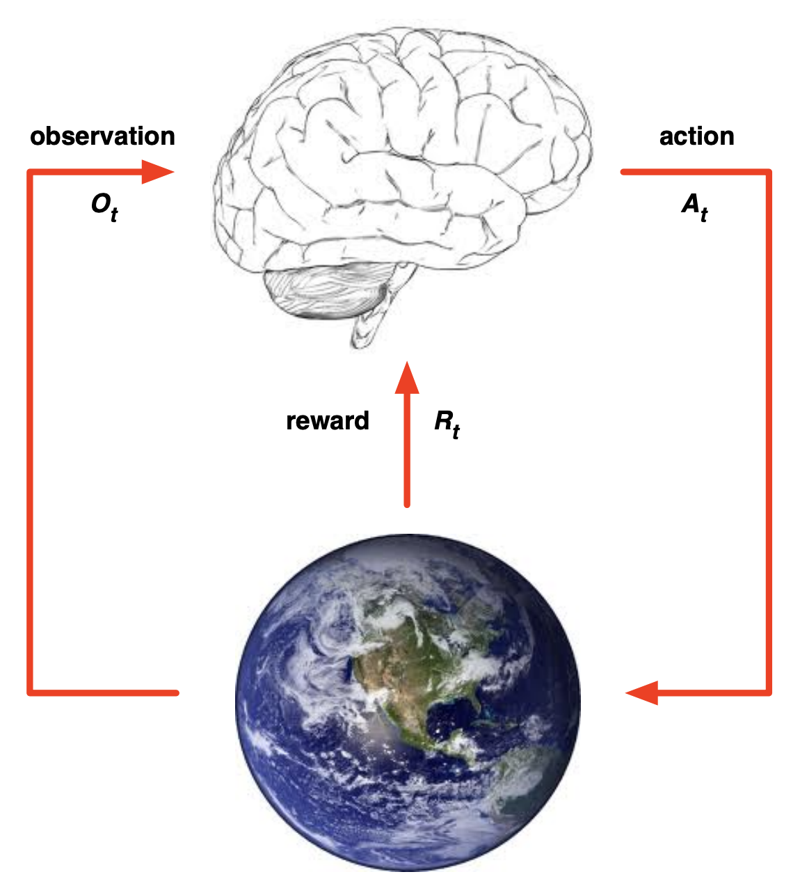 - Takes an action $A_t$ based off of the information that it’s receiving from the world (observation $O_{t}$) and the reward signal it’s getting ($R_{t}$).